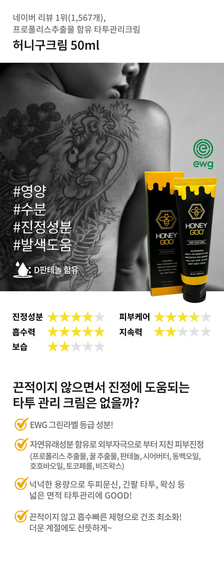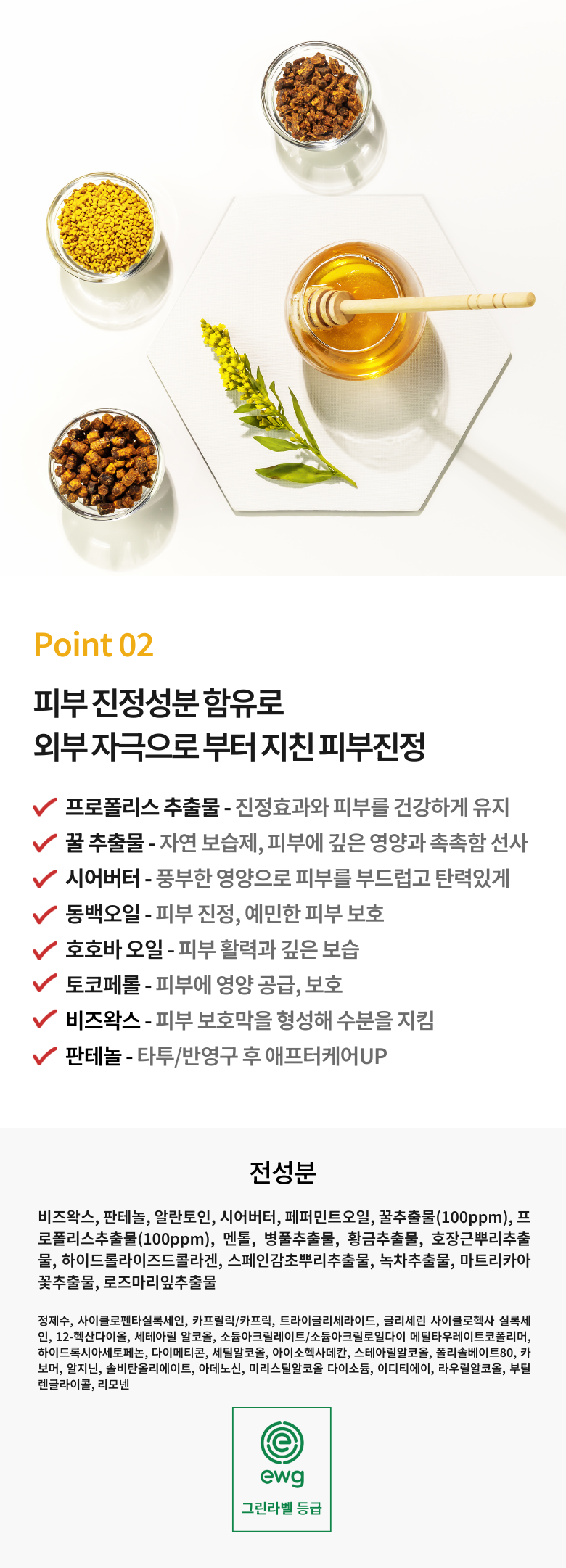 EWG 그린라벨 등급 성분!자연유래성분 함유로 피부 진정, 활력에 도움(프로폴리스 추출물, 꿀 추출물, 판테놀, 시어버터, 동백오일, 호호바오일, 토코페롤, 비즈왁스)- 끈적이지 않은 흡수빠른 제형